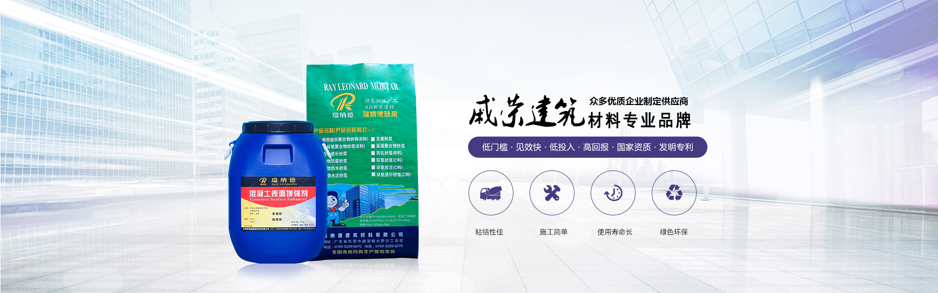 東莞市戚榮建筑材料有限公司是東莞市瑞納德建筑材料有限公司旗下子公司,是一家集研發、生產、銷售、技術服務為一體的技術型企業,,并通過ISO9001:2000質量管理體系及ISO14001:2004環境管理體系世界標準認證。現已在廣東、浙江、北京、河南鄭州、沈陽、重慶等均有生產基地。